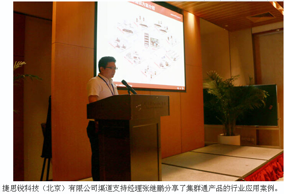 捷思銳科技(北京)有限公司總裁溫斌先生為大會致辭。溫總認(rèn)為,在移動互聯(lián)網(wǎng)浪潮和“互聯(lián)網(wǎng)+”概念推動下,以及移動互聯(lián)網(wǎng)和通信技術(shù)融合的快速發(fā)展,更多傳統(tǒng)企業(yè)開始積極擁抱移動互聯(lián)網(wǎng)。溫總向大家展示了“互聯(lián)網(wǎng)+對講機”的新時代下,捷思銳的集群通運營平臺產(chǎn)品及愿景,打造電信級業(yè)務(wù)平臺、一體化運營服務(wù)、良性的產(chǎn)業(yè)鏈,以構(gòu)建新的產(chǎn)業(yè)格局。