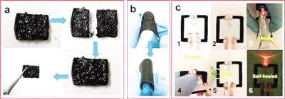 a)在被切成兩半后,導(dǎo)電超級(jí)凝膠不但能夠自我修復(fù),還能承受住被鑷子從一側(cè)夾起來(lái)時(shí)自身的重量。b)凝膠電路能夠自行修復(fù)因反復(fù)折疊產(chǎn)生的裂痕。c)一個(gè)自我修復(fù)電路點(diǎn)亮了LED燈,在被彎曲、切斷和折疊后都能實(shí)現(xiàn)自我修復(fù)。