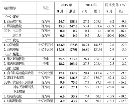 中國神華能源股份有限公司2015年8月份主要運營數(shù)據(jù):