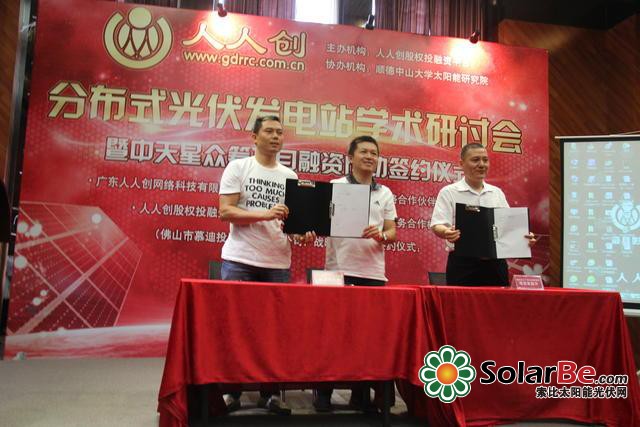此次人人創(chuàng)股權(quán)投融資平臺聯(lián)合順德中山大學(xué)太陽能研究院,正是借助全國首個眾籌分布式光伏發(fā)電站項目——“中天星工廠式光伏發(fā)電站項目”融資成功的契機(jī),成功舉辦“[人人創(chuàng)]分布式光伏發(fā)電站學(xué)術(shù)研討會暨中天星眾籌項目融資成功簽約儀式”,現(xiàn)場為我們解讀眾籌新模式的出現(xiàn)如何破局光伏產(chǎn)業(yè)的融資困境,并與專家學(xué)者們一同探討分布式光伏電站的全新發(fā)展模式,開啟人人創(chuàng)助力小微企業(yè)轉(zhuǎn)型發(fā)展的新路子。