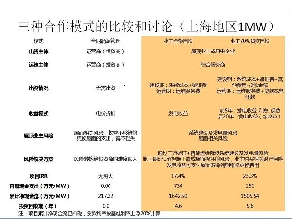 給大家算筆帳。以上海為例,假設(shè)有兩個(gè)條件完全一樣的1MW電站,一個(gè)是EMC模式,一個(gè)業(yè)主自投模式。因?yàn)镋MC模式,業(yè)主收入的只有租金,整個(gè)25年的生命周期里,電站的收益只在電價(jià)優(yōu)惠上;而業(yè)主自投完全不同,電站每發(fā)1度電,國(guó)家補(bǔ)貼、上海市補(bǔ)貼、與傳統(tǒng)火電相比節(jié)約的電費(fèi)以及余電上網(wǎng)回收的電費(fèi),整個(gè)收益加起來是EMC模式下,業(yè)主收益的4倍!