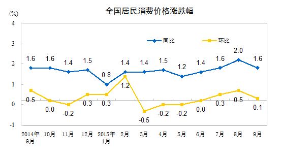 2015年9月份,全國居民消費(fèi)價格總水平同比上漲1.6%。其中,城市上漲1.6%,農(nóng)村上漲1.5%;食品價格上漲2.7%,非食品價格上漲1.0%;消費(fèi)品價格上漲1.4%,服務(wù)價格上漲2.1%。1-9月平均,全國居民消費(fèi)價格總水平比去年同期上漲1.4%。