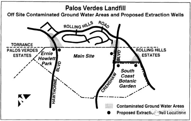 地下水:在填埋場中,發(fā)現(xiàn)兩個區(qū)域有地下水污染/污染羽。這些污染物影響地下大約20-70英尺的地下水。一個污染羽在霍桑大道,另一個在南岸植物園東南部。如下圖所示。霍桑大道污染羽的污染物為VOCs和砷。南岸植物園東南部污染物為VOCs。受污染地下水向場地外東北方向500-800英尺延伸。受污染地下水還沒有擴散污染到飲用水源。離垃圾場最近的飲用水源距離填埋場東北部有3~4英里。