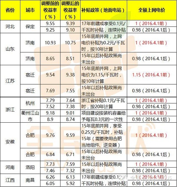 表中所用全額上網(wǎng)電價(2016.4.1前)依據(jù)國家發(fā)改委2013年發(fā)布的《關于發(fā)揮價格杠桿作用促進光伏產(chǎn)業(yè)健康發(fā)展的通知》,2016.4.1后的全額上網(wǎng)電價依據(jù)國家發(fā)改委今年十月下發(fā)的《關于完善陸上風電、光伏發(fā)電標桿上網(wǎng)電價的通知》。