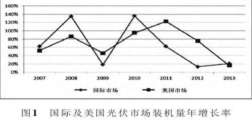 2012年國際光伏市場延續(xù)了上一年的跌勢。2013年,在歐洲傳統(tǒng)光伏市場補(bǔ)貼不斷削減、全球經(jīng)濟(jì)環(huán)境仍然脆弱,以及貿(mào)易爭端依舊在影響著整個(gè)產(chǎn)業(yè)的大背景下,光伏市場發(fā)展重心逐漸向新興光伏國家傾斜,中美日光伏市場加快崛起。2013年國際光伏市場走出了三年來的低谷,2014年全球光伏裝機(jī)量將達(dá)到43GW。2013年美國市場與國際市場增長率基本持平(見圖1)。
