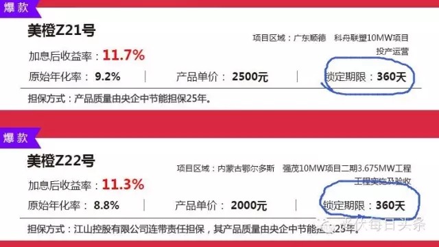 12月28日,綠能寶用戶收到了這樣的一條短信:“爆款來(lái)襲,加息后年化高達(dá)11.7%!上市公司擔(dān)保,投資安全穩(wěn)定!年終加息,滿贈(zèng)活動(dòng)進(jìn)行中,詳見(jiàn)綠能寶官網(wǎng)。”嚇?biāo)辣緦殞毩?,其?shí)這種加息后收益率的計(jì)算,是在原有收益率的基礎(chǔ)上進(jìn)行疊加的結(jié)果,這兩款產(chǎn)品都帶有附加的擔(dān)保責(zé)任,與之前剛剛發(fā)布的航天米寶所宣稱的“有保險(xiǎn)的P2P產(chǎn)品”,有著異曲同工之妙。
