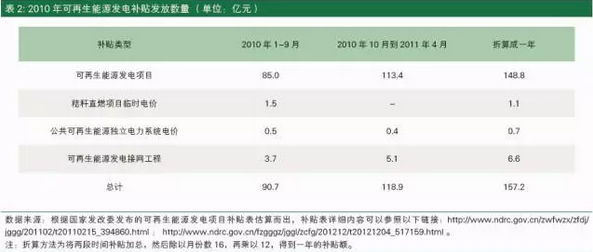 以2010年為比較年份。圖1顯示,2010年的電價(jià)附加征收額為154億元。表2顯示,折算后的2010年可再生能源發(fā)電項(xiàng)目補(bǔ)貼為157.2億元。二者之間基本一致,可以說(shuō)2010年可再生能源發(fā)電項(xiàng)目補(bǔ)貼基本沒(méi)有缺口。