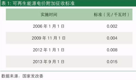 為了滿足可再生能源電力發(fā)展,并且彌補(bǔ)可再生能源補(bǔ)貼拖欠,從2016年1月1日起,可再生能源電價(jià)附加征收標(biāo)準(zhǔn)從之前的1.5分/千瓦時(shí)提高到1.9分/千瓦時(shí)。這次發(fā)改委從頒布通知到開(kāi)始正式執(zhí)行僅兩天之隔,一定程度上反映了增加附加滿足補(bǔ)貼的緊迫性。這與我們關(guān)于電價(jià)附加會(huì)在近期上調(diào)的預(yù)測(cè)吻合,但實(shí)際增加的幅度卻遠(yuǎn)遠(yuǎn)低于我們的預(yù)估。下面這篇分析給出了詳細(xì)解釋。