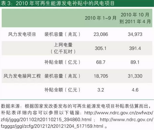 征收的電價(jià)附加能否滿足可再生能源電力補(bǔ)貼的需求呢?我們參照發(fā)改委發(fā)布的數(shù)據(jù)來(lái)看。根據(jù)表2顯示,電價(jià)附加的主要補(bǔ)貼對(duì)象是可再生能源發(fā)電項(xiàng)目,接網(wǎng)費(fèi)用占比很小,約為4.2%。在可再生能源發(fā)電項(xiàng)目中占比最多的是風(fēng)電,因?yàn)樵?010年,太陽(yáng)能發(fā)電項(xiàng)目還非常少。依據(jù)表3,2010年1月-2011年4月,上網(wǎng)風(fēng)電發(fā)電量達(dá)到696.5億千瓦時(shí),補(bǔ)貼金額為157.8億元,占到同期可再生能源發(fā)電項(xiàng)目補(bǔ)貼額198.4億元的80%。