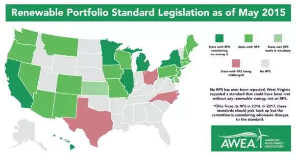 美國是第一個實行可再生能源配額制的國家,也是實行可再生能源配額制較為成功的一個國家。截至2015年5月,已有30多個州依據(jù)本州資源、市場、政策背景制定并實施了可再生能源配額制,實施RPS的州和地區(qū)分布如下圖。據(jù)憂思科學(xué)家聯(lián)盟預(yù)測,到2025年,可再生能源配額制將促使美國的可再生能源電力增加76750MW,配額制對可再生能源發(fā)展的促進功能由此可見一斑。