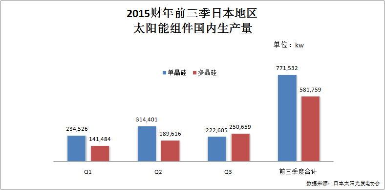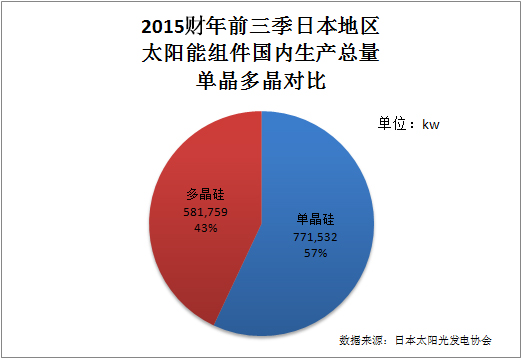 另外,從生產供應上來看,單晶組件也在日本國內也占絕對的主流地位。根據日本太陽光發(fā)電協(xié)會的統(tǒng)計數(shù)據(下圖),2015財年前三季(第四季未統(tǒng)計)日本國內單晶組件生產總量達到771532kw,占比57%,遠超多晶43%??梢钥闯?,日本對單晶組件的重視是要大于多晶組件的。
