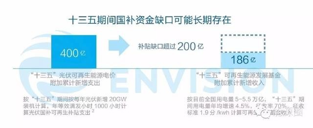 根據(jù)遠景能源阿波羅光伏的初步測算,“十三五”期間僅光伏新增裝機所需的補貼就達到400億元,而同期社會新增用電量帶來的可再生能源基金新增收入只有186億元,在不考慮存量缺口的情況下,又增加了新的資金缺口。