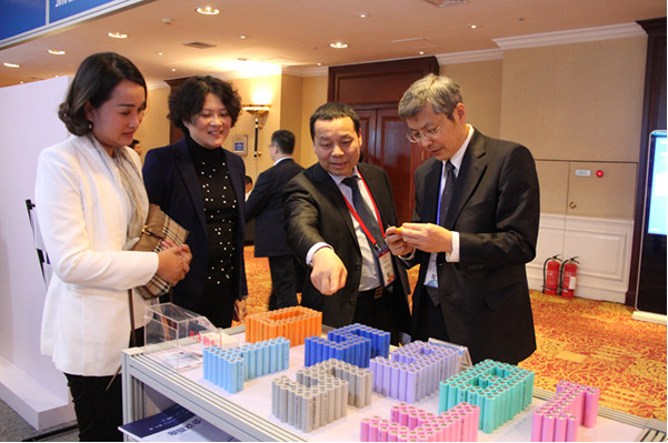 智慧能源展臺前蔣華君向嘉賓介紹遠東福斯特新能源有限公司18650鋰電池及應(yīng)用