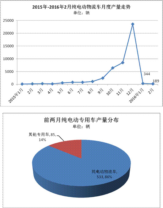 純電動專用車在經(jīng)歷了2015年大幅度擴張后,今年前兩月迅速下滑至冰點,兩月累計產(chǎn)量僅600多輛,與去年同期(330輛)相比凈增量僅270輛。其中,作為純電動專用車領(lǐng)域的重要分支,同樣呈現(xiàn)大幅下滑。前兩月純電動物流車產(chǎn)量占比達86%,主要包括4-6米的純電貨車。產(chǎn)量達533輛,同比增長93%。