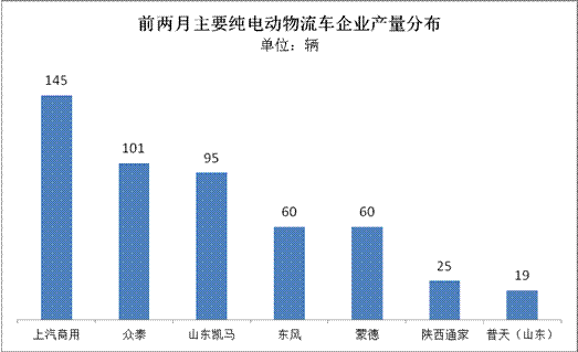 分車企看,前兩月純電動物流車有產(chǎn)量的企業(yè)達20家,其中產(chǎn)量僅1輛的車企就達9家,而對應產(chǎn)量超過10輛的車企僅7家。超過百輛的車企僅2家:上汽商用車和眾泰;兩家產(chǎn)量總計達246輛,占據(jù)前兩月純電動物流車總產(chǎn)量的46%。