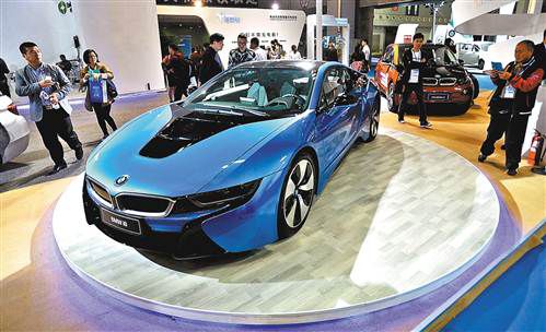 圖為參展的寶馬i8新能源汽車,車門比傳統(tǒng)車門重量輕50%。