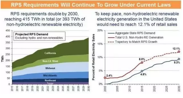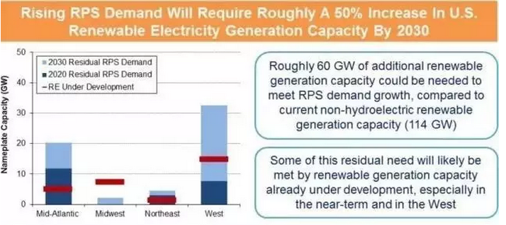 至2030年,可再生能源配額制需求將增加60GW的可再生能源發(fā)電量,大約增加為目前非水可再生能源發(fā)電量的50%(2015年為114GW)。