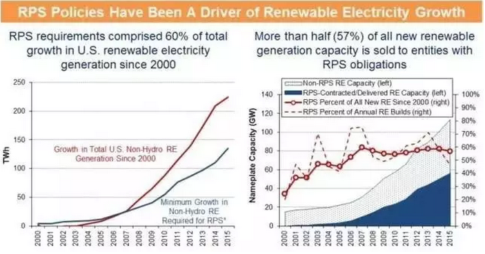 自2000年以來(lái)有超過(guò)一半的可再生能源發(fā)電量(60%)是源于各州可再生能源配額制政策的出臺(tái)。