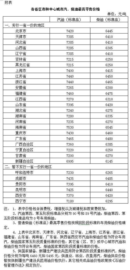 附:各省區(qū)市和中心城市汽、柴油最高零售價格表