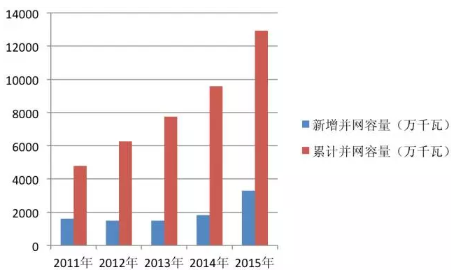 與裝機(jī)容量相比,并網(wǎng)容量所反映的市場情況具有滯后性,但能體現(xiàn)出有多少風(fēng)電機(jī)組已經(jīng)可以用于發(fā)電。2015年中國風(fēng)電新增并網(wǎng)容量達(dá)到了3297萬千瓦,比2014年的1823萬千瓦增加明顯。2015年累計并網(wǎng)容量為12934萬千瓦,與新增并網(wǎng)容量一樣,其增幅是近五年中最高的。