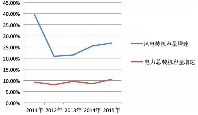 與近年來總發(fā)電裝機(jī)容量的增速相對穩(wěn)定,保持在8%至11%左右相比,風(fēng)電裝機(jī)容量增速波動幅度更大,但總體來說,從2012年開始保持了增速不斷增高的趨勢。2015年中國風(fēng)電裝機(jī)容量增速超過了全國總發(fā)電裝機(jī)容量增速的一倍。
