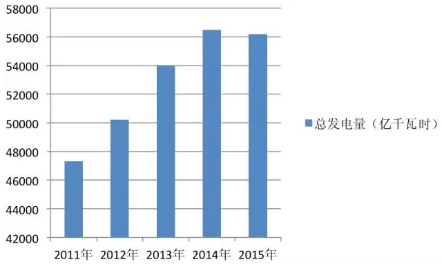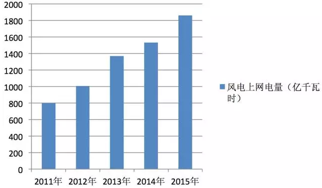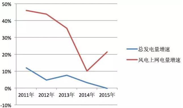 2015年全國總發(fā)電量為56184億千瓦時,相比2014年的56496億千瓦時有所下降,也是近些年來全國總發(fā)電量的首次下降。與全國總發(fā)電量下降相比,2015年風(fēng)電上網(wǎng)電量再創(chuàng)新高,達(dá)到了1863億千瓦時。2015年的風(fēng)電上網(wǎng)電量并非近五年增幅最高的,相比于2011年45%以上、2012年40%以上和2013年35%以上的增長幅度,2015年風(fēng)電上網(wǎng)電量同比增長相差甚遠(yuǎn),僅超過了20%。但這已經(jīng)比2014年的10%的增幅提高了不少。這樣的發(fā)電量增長速度,是在全國電力需求放緩的背景下獲得的,顯得更為不易。