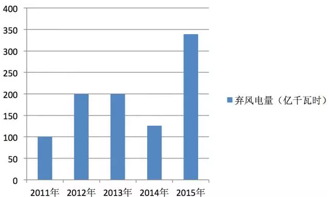 2015年的棄風(fēng)率與2013年和2014年相比又有了明顯升高,達(dá)到了15%。雖然公開數(shù)據(jù)顯示棄風(fēng)率并不是近五年中最高的,但由于機(jī)組并網(wǎng)容量逐年提高,棄風(fēng)電量在2015年創(chuàng)出歷史之最,達(dá)到了339億千瓦時,比2014年高出一倍以上。2015年因棄風(fēng)所造成的經(jīng)濟(jì)損失嚴(yán)重,電費損失達(dá)183億元,折合標(biāo)煤1088萬噸。相當(dāng)于2000萬千瓦的風(fēng)電裝機(jī)被浪費,也就是400個5萬千瓦風(fēng)電場一年的電費收入白白損失掉,意味著2015年三分之二的新增裝機(jī)容量沒有產(chǎn)生任何效益。