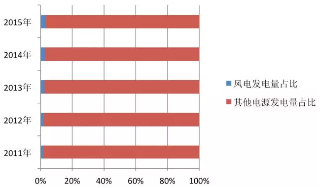 在近五年,風(fēng)電上網(wǎng)電量的增幅一直高于全國發(fā)電量的增幅,說明其在各類電源發(fā)電量中所占的比例不斷提高。2011年時,風(fēng)電上網(wǎng)電量占全國總發(fā)電量的1.67%,到2015年則已占到3.3%。