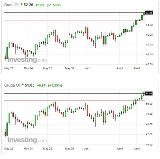 受尼日利亞減產(chǎn)、中國(guó)需求上升等因素影響,國(guó)際油價(jià)周三上漲。布倫特原油漲破52美元,創(chuàng)去年10月以來(lái)新高。美國(guó)WTI原油漲破51美元,創(chuàng)去年7月以來(lái)新高。