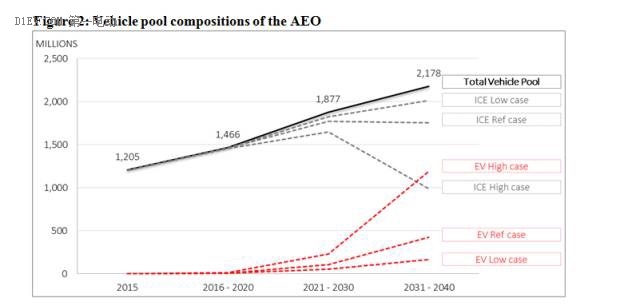 第一,展望中提出的可參考模型假設(shè)。在2020年前,全球電動汽車銷售量會保持現(xiàn)有的50%的年增長率。2021-2030年間,電動汽車將保持30%的年增長率,而到2030年-2040年,這一增幅將下降到15%。