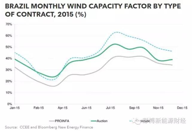 •目前,電力批發(fā)市場內的風電項目的容量系數最高,達44%。其次,為巴西國家電力招標的中標項目,達38%。而參與巴西過去Proinfa入網電價方案的風電項目,其容量系數平均僅為32%。