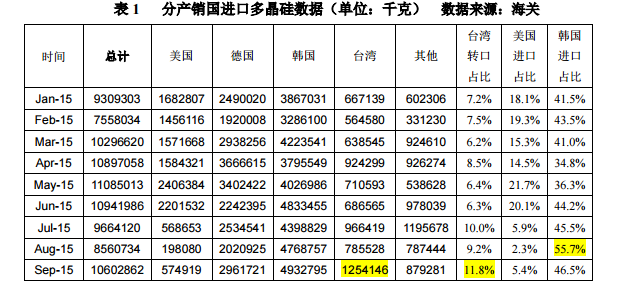 一、從臺(tái)灣進(jìn)口多晶硅量連續(xù)9個(gè)月維持在千噸以上,4月份更是增加至1941噸,創(chuàng)歷史新高,占總進(jìn)口量的16.0%,較以往正常進(jìn)口量增加兩倍以上,5月份也維持在1511噸的高位,占總進(jìn)口量的14.9%。正是由于通過臺(tái)灣進(jìn)口規(guī)避“雙反”征稅的方式已經(jīng)逐漸成為主流,且愈發(fā)猖狂,所以即便從美國進(jìn)口量大幅減少,自美國和臺(tái)灣進(jìn)口量之和也仍在2000噸/月左右,與美國未減少之前無異。而眾所周知臺(tái)灣并沒有多晶硅生產(chǎn)企業(yè),但海關(guān)數(shù)據(jù)中臺(tái)灣卻作為原產(chǎn)地出現(xiàn),只因海關(guān)8位編碼不能將多晶硅與鑄錠區(qū)分開來,而臺(tái)灣又恰好有鑄錠企業(yè),因此使得調(diào)查困難重重。