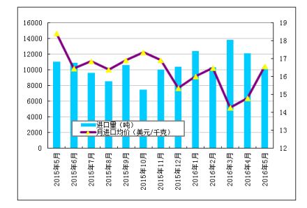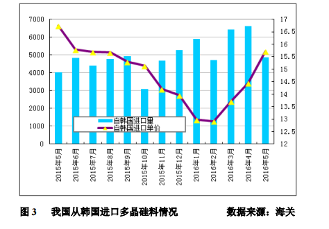 2016年5月份從韓國進(jìn)口多晶硅量為4875噸,環(huán)比增加26.3%;進(jìn)口單價(jià)微幅回升至15.72美元/千克,環(huán)比上漲為8.7%。