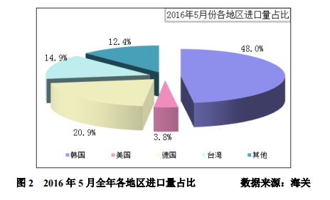 5月份從韓國進(jìn)口量為4875噸,占總進(jìn)口量的48.0%;從美國進(jìn)口量為383噸,占總進(jìn)口量的3.8%;從德國進(jìn)口量為2127噸,占總進(jìn)口量的20.9%;從臺(tái)灣進(jìn)口量為1511噸,占總進(jìn)口量的14.9%;其他地區(qū)進(jìn)口量為1263噸,占總量的12.4%。