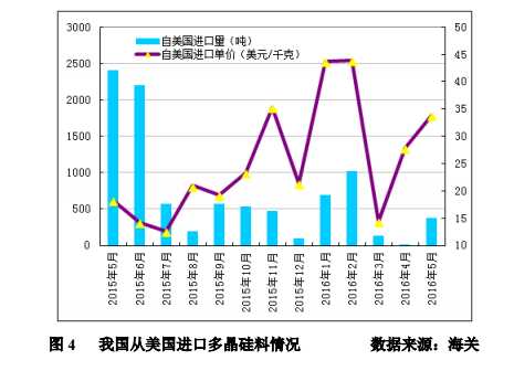 2016年5月份從美國進(jìn)口多晶硅量為383噸,環(huán)比大幅增加28.5倍;5月份進(jìn)口單價(jià)大幅增加至33.91美元/千克,環(huán)比增幅為21.7%。