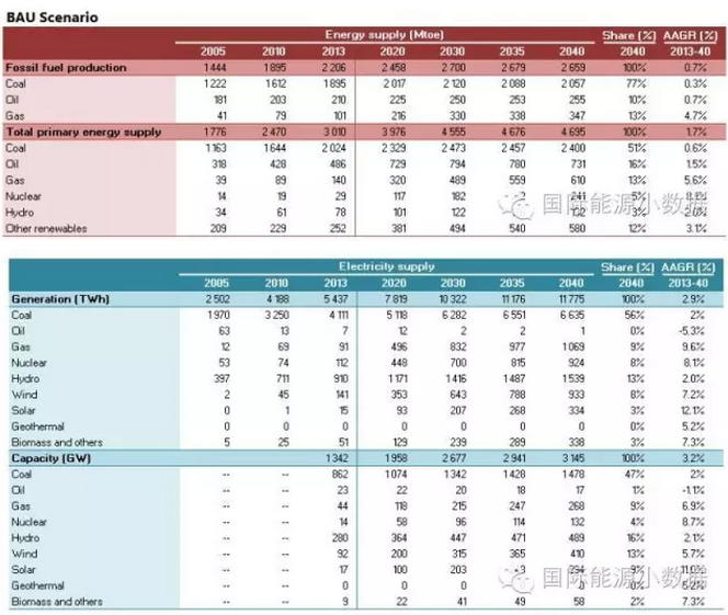 2040年一次能源供應達到46.95億噸標油,其中煤炭占51%、石油16%、天然氣13%、核電5%、水電3%、非水可再生能源12%。從發(fā)電量來看,2040年總裝機達3145吉瓦,發(fā)電量達11.78萬億千瓦時,煤電占56%、天然氣發(fā)電9%、核電8%、水電13%、風電8%、光伏3%、生物質(zhì)3%。