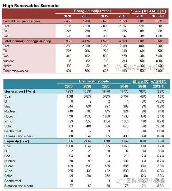 在高比例可再生能源的情境下,2040年一次能源供應為45.69億噸標油,其中煤炭仍占48%、石油16%、天然氣13%、核電5%、水電3%、非水可再生能源15%。從發(fā)電量來看,2040年總裝機達3365吉瓦,發(fā)電量達11.78萬億千瓦時,煤電占49%、天然氣發(fā)電8%、核電8%、水電15%、風電11%、光伏6%、生物質(zhì)4%。