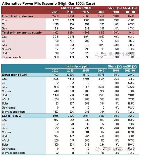 在大力推廣天然氣發(fā)電的情境下,2040年一次能源供應為46.13億噸標油,其中煤炭跌至40%、石油16%、天然氣高達23%、核電5%、水電3%、非水可再生能源13%。從發(fā)電量來看,2040年總裝機達3146吉瓦,發(fā)電量達11.78萬億千瓦時,煤電占36%、天然氣發(fā)電30%、核電8%、水電13%、風電8%、光伏3%、生物質(zhì)3%。