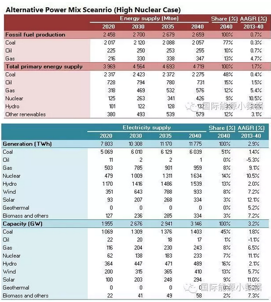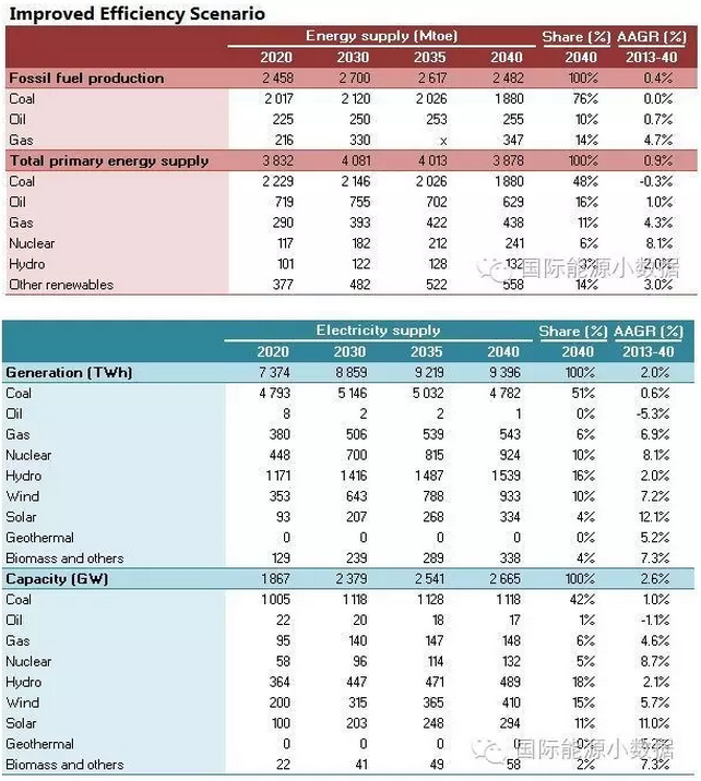 在大大提高能效的情境下,2040年一次能源供應只有38.78億噸標油,其中煤炭仍占48%、石油16%、天然氣11%、核電6%、水電3%、非水可再生能源14%。從發(fā)電量來看,2040年總裝機達2665吉瓦,發(fā)電量達9.39萬億千瓦時,煤電占51%、天然氣發(fā)電6%、核電10%、水電16%、風電10%、光伏4%、生物質(zhì)4%。