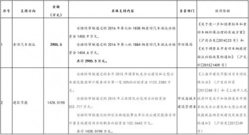 1、按照《上海市人民政府辦公廳印發(fā)市交通委等六部門制訂的<關(guān)于進(jìn)一步加強(qiáng)黃標(biāo)車和老舊車輛環(huán)保治理的實施方案>的通知》(滬府辦發(fā)[2014]23號)、《關(guān)于調(diào)整本市老舊車輛提前淘汰補(bǔ)貼政策的通知》(滬交科[2015]1409號)等有關(guān)規(guī)定,安排經(jīng)審核通過的2016第七批1838輛老舊汽車淘汰補(bǔ)貼資金1450.9萬元,第八批1884輛老舊汽車淘汰補(bǔ)貼資金1454.6萬元,共計2905.5萬元。