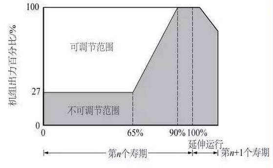 法國(guó)核電的建造始于20 世紀(jì) 50 年代,早期建設(shè)的核電站均為 GCR(氣冷堆)類(lèi)型核電機(jī)組,不具備負(fù)荷調(diào)節(jié)能力。隨著法國(guó)核電所占比例不斷上升,到20世紀(jì)80年代電網(wǎng)調(diào)峰問(wèn)題開(kāi)始逐步顯現(xiàn),電網(wǎng)調(diào)峰日益困難,而受資源、地理?xiàng)l件等的限制,法國(guó)氣電、抽水蓄能電站的建設(shè)均受到了一定的制約。在此情況下,法國(guó)在80年代初開(kāi)始研究對(duì)原有核電機(jī)組進(jìn)行技術(shù)改造,到90年代初法國(guó)核電機(jī)組法國(guó)核電機(jī)組從設(shè)計(jì)角度,在燃料的前65%壽期內(nèi),最低可降出力至27%額定功率;在燃料前65%~90%壽期內(nèi),機(jī)組可調(diào)范圍呈線性減小趨勢(shì),最小技術(shù)出力逐步增大;到90%~100%壽期和燃料延伸運(yùn)行階段,機(jī)組已不具備調(diào)節(jié)能力,一個(gè)壽期內(nèi)機(jī)組調(diào)峰能力變化情況詳見(jiàn)下圖。