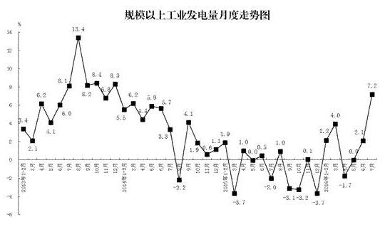 7月份,規(guī)模以上工業(yè)發(fā)電量同比增長7.2%,增速為2014年2月以來最高,比6月份加快5.1個百分點;1-7月份,規(guī)模以上工業(yè)發(fā)電量同比增長2.0%,增速比1-6月份加快1.0個百分點。