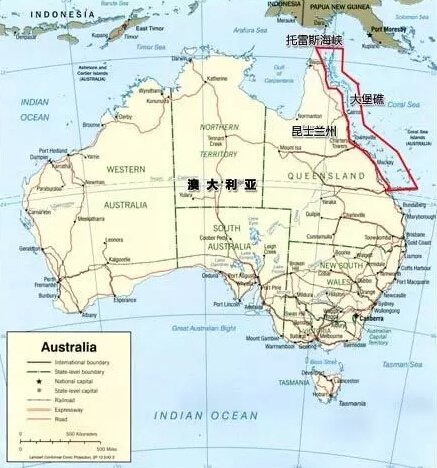 圖中的紅色線條框住的部分就是大堡礁:縱貫澳洲東北沿海,北從托雷斯海峽,南至南回歸線以南,綿延伸展2011公里,含有2900個大大小小的珊瑚礁島,是世界最大最長的珊瑚礁群。面積與整個意大利或者日本國土面積相當(dāng)。