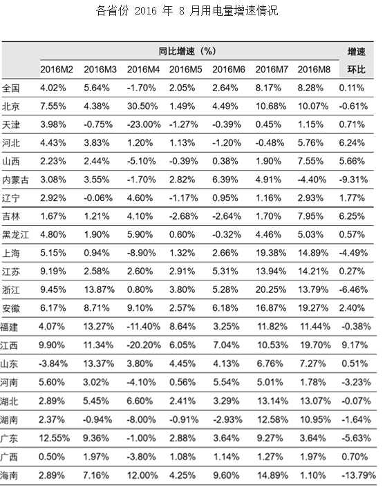 2016 年 1-8 月,全國(guó)有寧夏、云南、青海、甘肅 4 省用電呈現(xiàn)負(fù)增長(zhǎng)。從分省情 況來(lái)看,用電量同比增長(zhǎng)超過(guò)全國(guó)平均水平的省份依次為:西藏(17.77%)、新疆 (12.24%)、江西(9.74%)、安徽(9.52%)、陜西(9.24%)、浙江(8.66%)、 北京(6.98%)、上海(6.90%)、江蘇(6.85%)、湖北(6.68%)、福建(6.28%)、 海南(6.25%)、廣東(4.88%)。這些省份大部分分布在華東、華中、南方地區(qū), 為外送電較多、經(jīng)濟(jì)發(fā)展較快的省份。