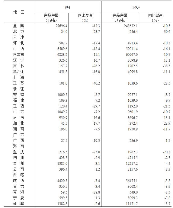 1-9月份,全國規(guī)模以上工業(yè)1原煤產(chǎn)量24.6億噸,同比減少2.9億噸,下降10.5%;9月份,原煤產(chǎn)量2.8億噸,同比下降12.3%,降幅比8月份擴(kuò)大1.3個(gè)百分點(diǎn),日均產(chǎn)量923.2萬噸,環(huán)比增長26.2萬噸。