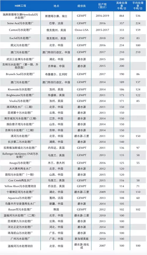 GE水處理專注于工業(yè)和生活廢水再利用,以化學(xué)助劑和監(jiān)測平臺(tái)、工程化的設(shè)備和系統(tǒng)的組合來應(yīng)對(duì)棘手的污水處理的需要。其近期業(yè)績暫無詳細(xì)統(tǒng)計(jì),但截至2015年3月為止,在全球大型MBR工程項(xiàng)目(含在建項(xiàng)目)中,GE占17個(gè),如下表所示(信息數(shù)據(jù)來源于MBRsite)