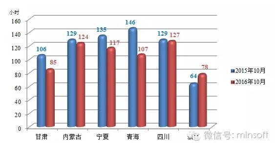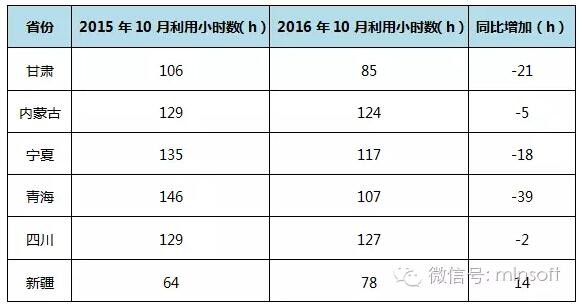 由以上圖表可以看出,2016年10月,新疆平均利用小時數(shù)比去年同期增加14小時,四川與去年同期基本持平,其他四省與去年同期相比均有不同程度降低。其中新疆10月平均利用小時數(shù)為78小時,比去年同期增加14小時;四川10月平均利用小時數(shù)為127小時,比去年同期減少2小時;內(nèi)蒙古10月平均利用小時數(shù)為124小時,比去年同期減少5小時;青海10月平均利用小數(shù)與去年同期相比變化最為劇烈,減少39小時;甘肅其次,比去年同期減少了21小時;寧夏10月平均利用小數(shù)也比去年同期減少了18小時。