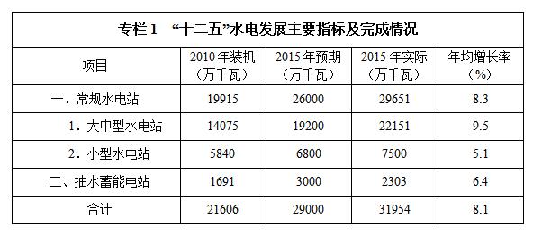 ——裝機規(guī)模不斷躍升。“十二五”期間,新增水電投產裝機容量10348萬千瓦,年均增長8.1%,其中大中型水電8076萬千瓦,小水電1660萬千瓦,抽水蓄能612萬千瓦。到2015年底,全國水電總裝機容量達到31954萬千瓦,其中大中型水電22151萬千瓦,小水電7500萬千瓦,抽水蓄能2303萬千瓦,水電裝機占全國發(fā)電總裝機容量的20.9%。2015年全國水電發(fā)電量約1.1萬億千瓦時,占全國發(fā)電量的19.4%,在非化石能源中的比重達73.7%。