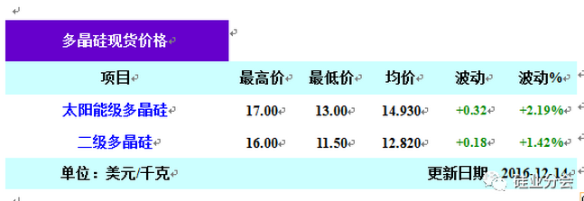 本周國內(nèi)多晶硅現(xiàn)貨價格繼續(xù)回升,太陽能一級致密料報價區(qū)間在13.1-14.0萬元/噸,均價為13.75萬元/噸,周環(huán)比增幅為0.88%。一級致密料成交價區(qū)間在13.1-14.0萬元/噸,均價為13.61萬元/噸,周環(huán)比漲幅為0.81%。本周進口多晶硅主流報價13.00-17.00美元/千克,均價為14.93美元/千克,周環(huán)比漲幅為2.19%;156mm多晶硅晶圓報價0.62-0.70美元/片,均價降至0.634美元/片,周環(huán)比降幅為1.25%;156mm多晶硅電池片報價為0.85-1.28美元/片,均價下滑至0.996美元/片,周環(huán)比降幅為1.48%;晶硅太陽能電池組件報價在0.32-0.45美元/瓦,均價下滑至0.379美元/瓦,周環(huán)比降幅為1.30%。