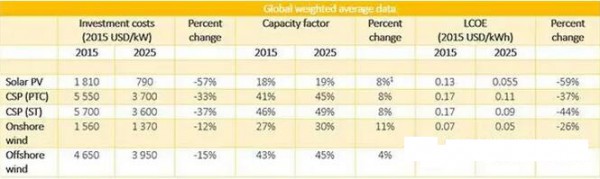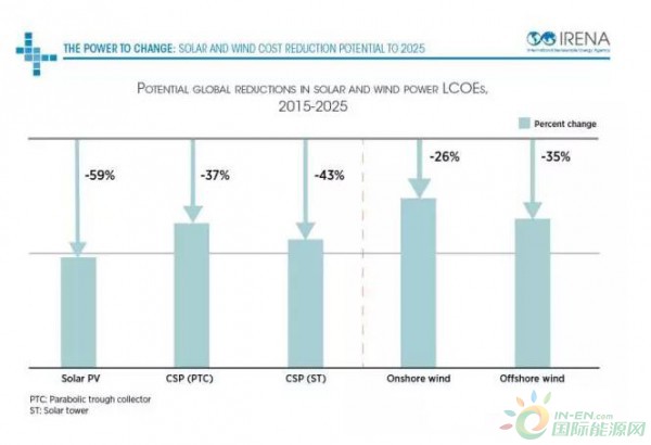 根據(jù)國際可再生能源署剛剛發(fā)布的報告預(yù)測,光伏、光熱、陸上和海上風(fēng)電成本將大幅度下降: